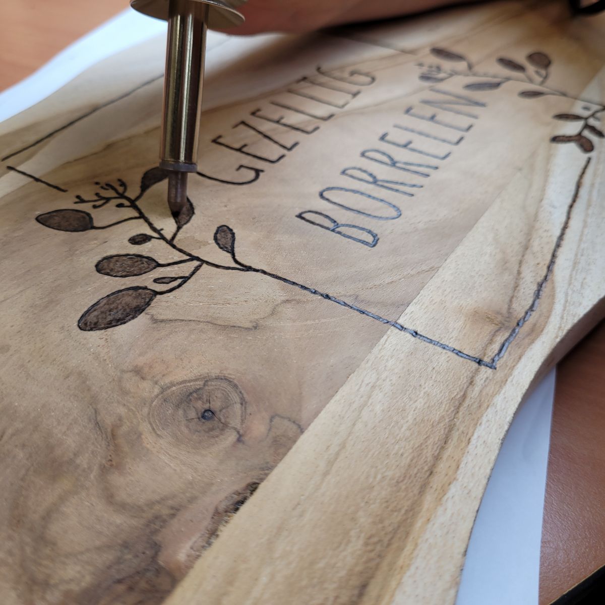 We gaan aan de slag met een houtbrander. Zoek je eigen borrelplank uit bij ons en maak hem precies zoals jij hem hebben wilt. Ik leg je de beginselen van het houtbranden uit en heb een flinke stapel voorbeelden klaar liggen om op je plank te branden.