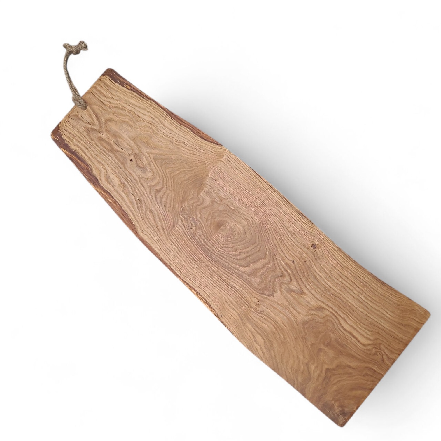 De lengte van deze plank is ongeveer 100cm, de breedte is verschillend, maar kan soms wel 30cm zijn op zijn breedst. De planken zijn foodsafe.